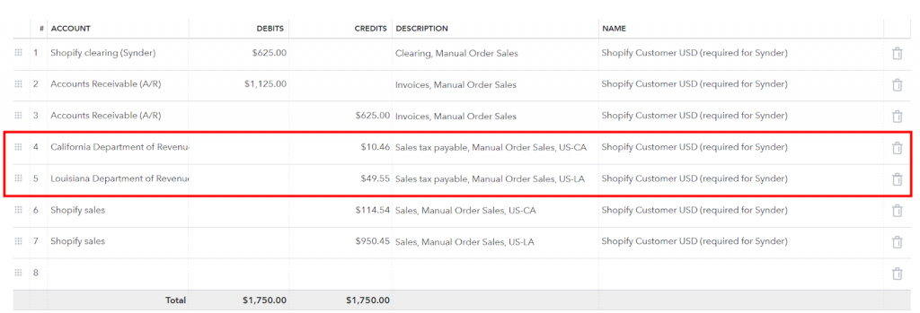 QuickBooks Online (US) does not allow tax codes in journal entries. Synder posts sales tax amounts directly to Sales Tax Payable liability accounts.