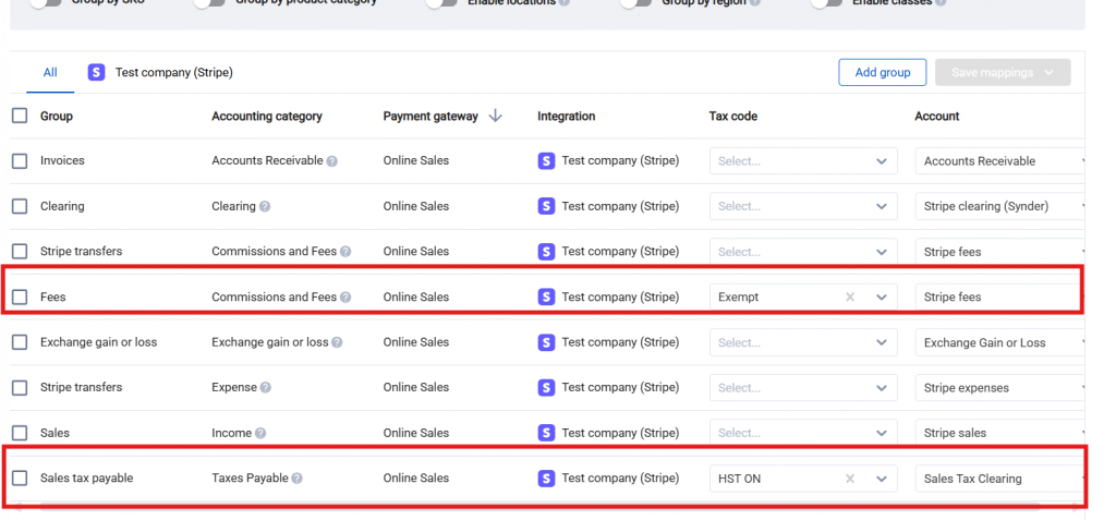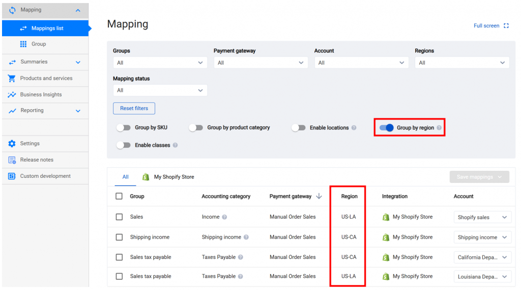 Note: Enabling Group by region also groups Sales, Refunds, Shipping income, and other mapping lines by region.