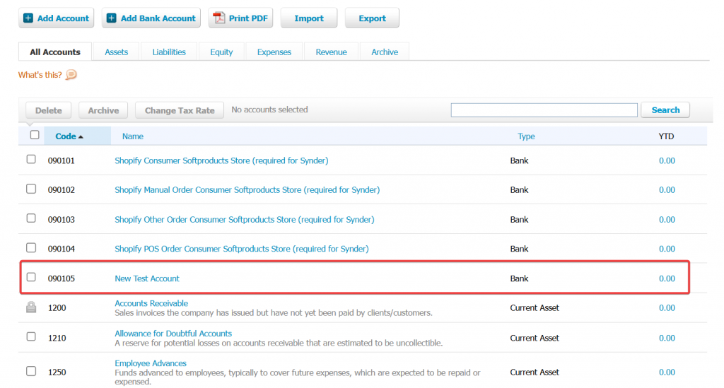 Once refreshed, all updated and new information from Xero will be available in Synder. For example, we will now be able to locate the account we created earlier.