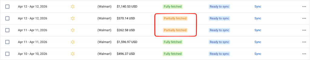 Synder syncs totals only. Use Walmart’s Payments Report for details.