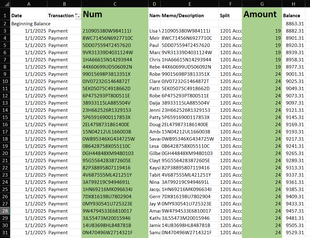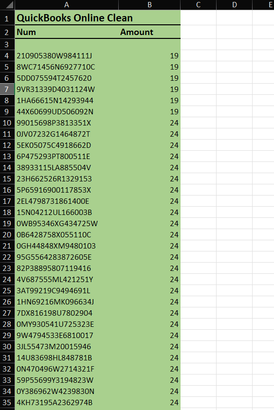 Copy values of Num and Amount columns into a new sheet. This will be our QuickBooks Online clean report.