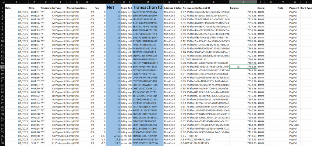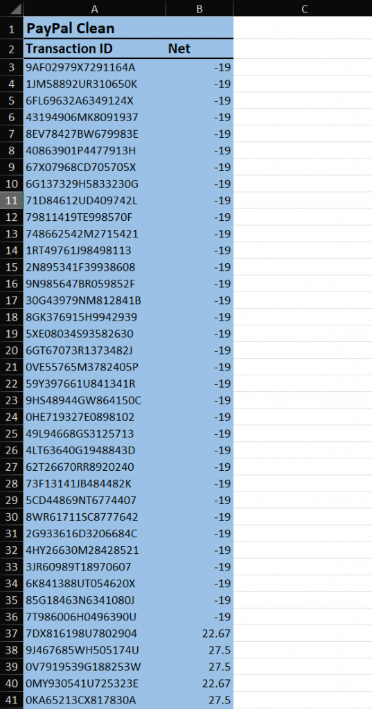 Copy values of Transaction ID and Net columns into a new sheet. This will be our PayPal clean report.