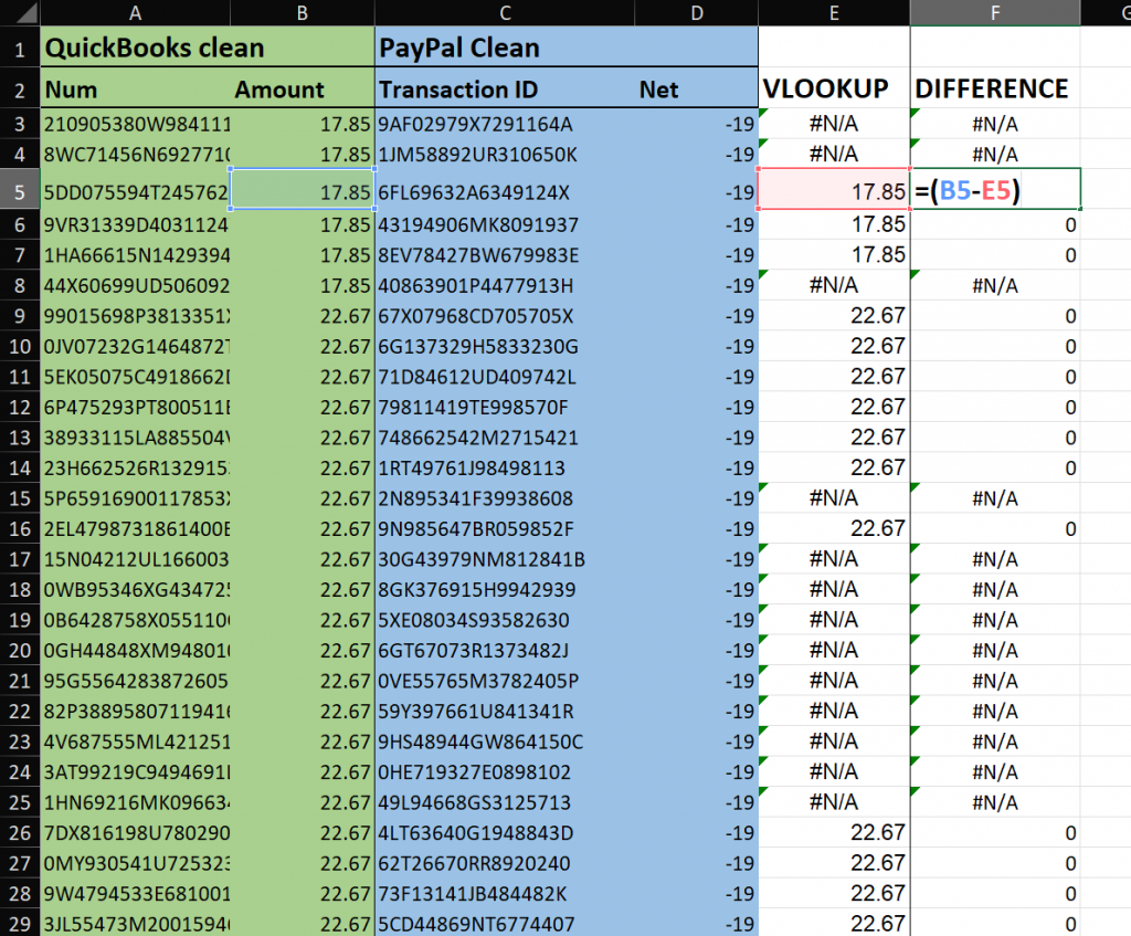 In the Difference column, calculate the difference by subtracting the looked-up amount from the PayPal amount.