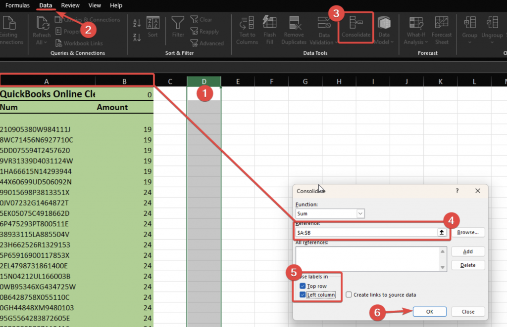- Go to Data → Consolidate.