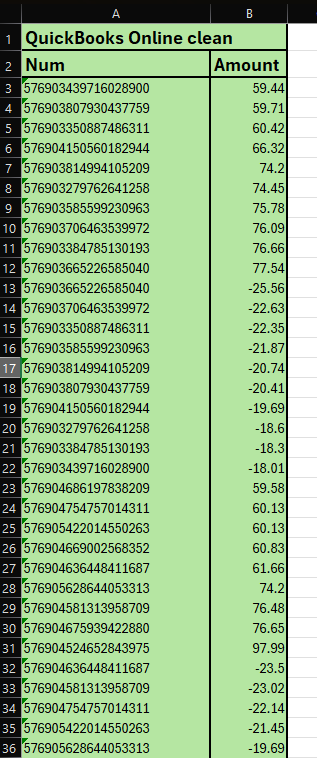 - C:D = Your QuickBooks Online data range (ID in column C, amount in column D)