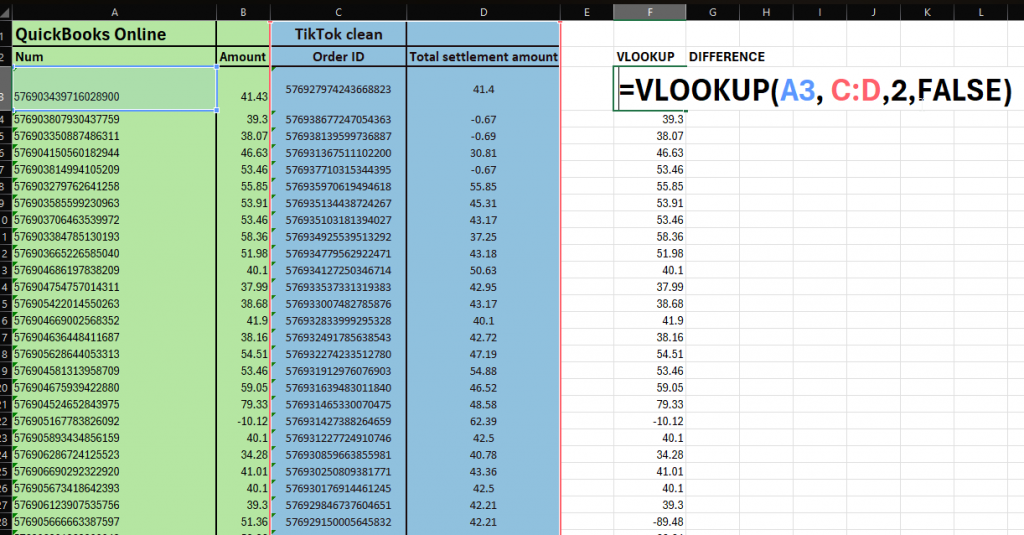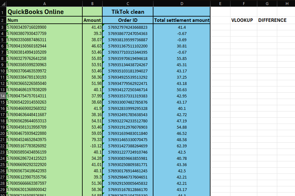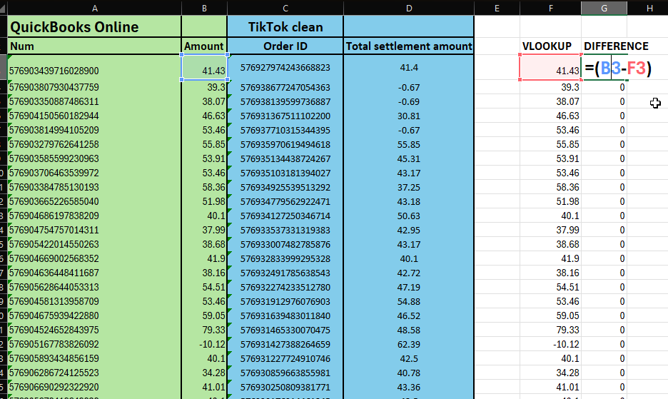 In the Difference column, calculate the difference by subtracting the looked-up amount from the TikTok amount.