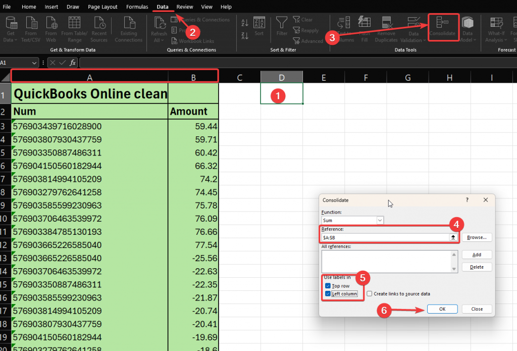 - Go to Data → Consolidate.