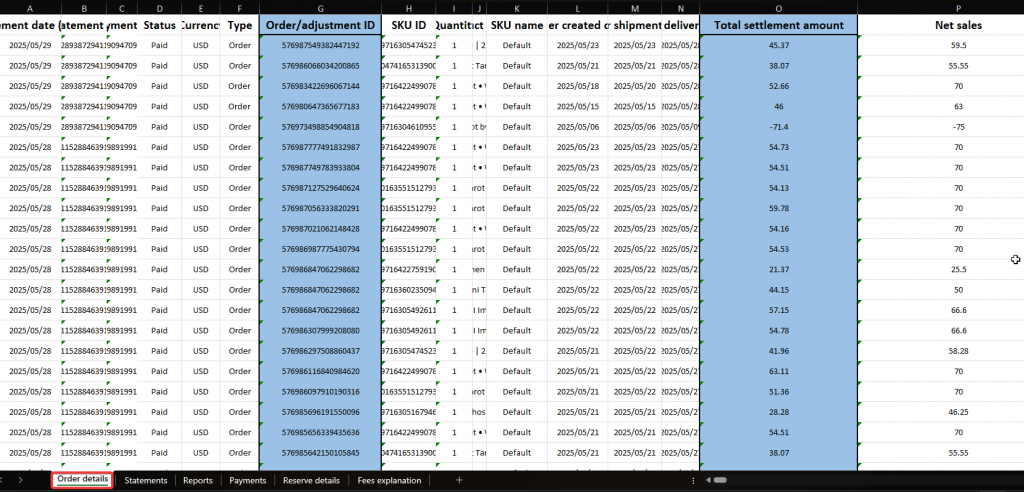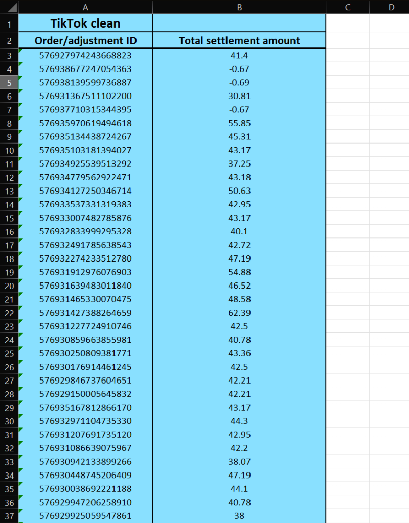 Copy values of Order/Adjusment ID and Total settlement amount columns into a new sheet. This will be our TikTok clean report.