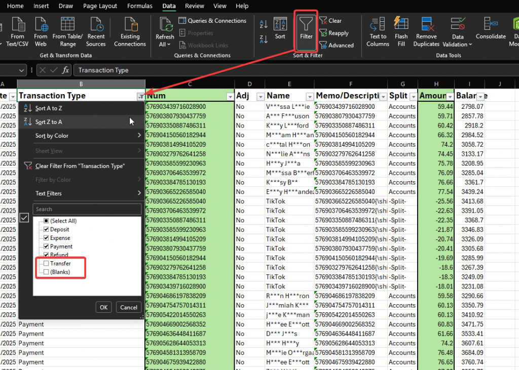 QuickBooks reports include unnecessary details. To create a clean comparison sheet, filter the Transaction Type column for “Transfer,” then copy the values from the Num and Amount columns into a new sheet.