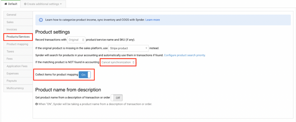 If a product name does not exist in your accounting system, Synder can create it during sync. You can configure this behavior in the Products/Services tab.