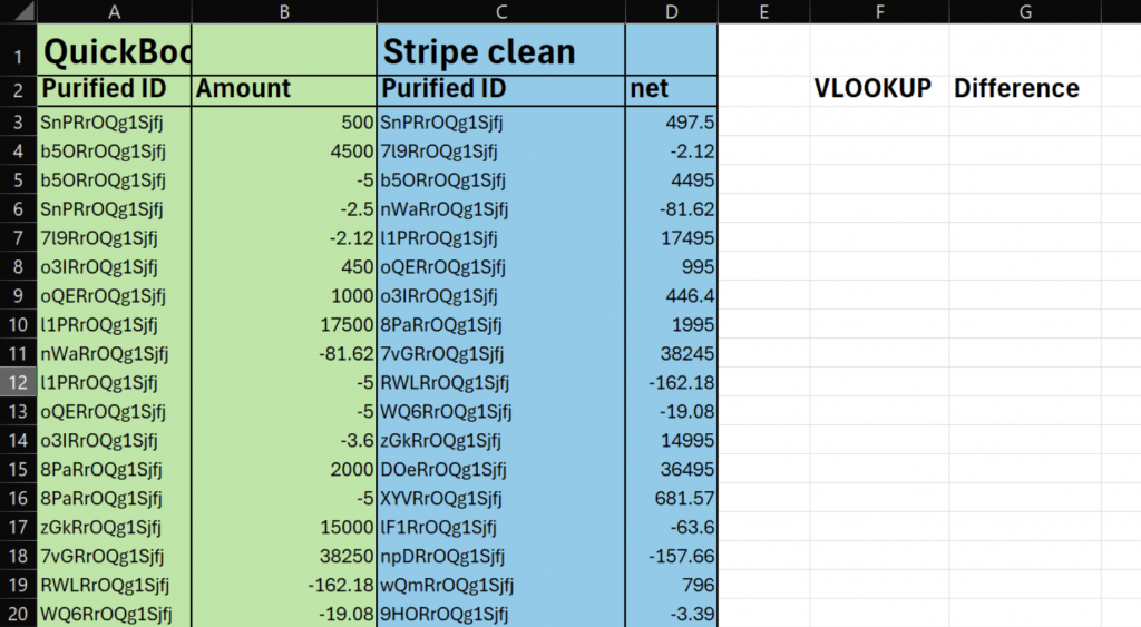 - Copy your cleaned Stripe IDs and amounts to columns A and B.