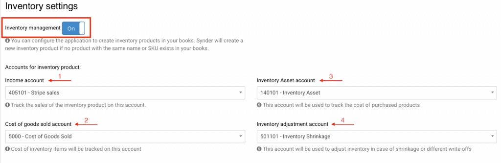 - Inventory Management** – When enabled, Synder supports inventory products and posts inventory transactions. You must select the inventory asset account and cost of goods sold (COGS) account. See more details about the inventory below.