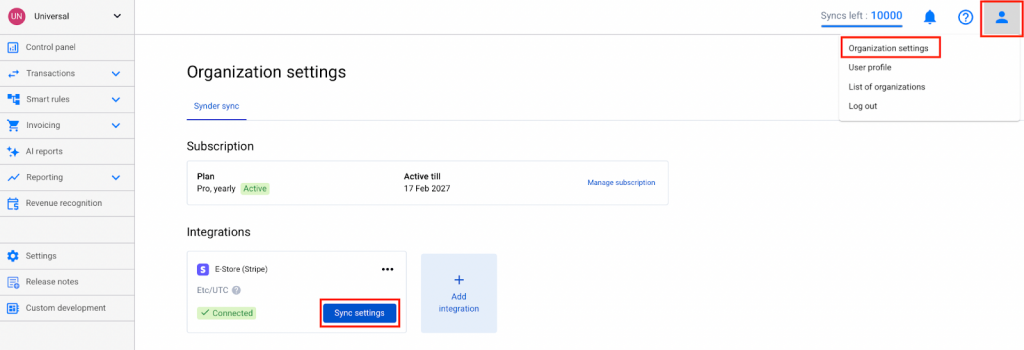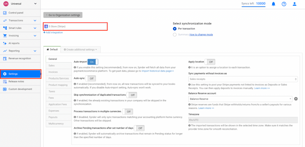 With your company and accounts connected, you can start customizing the Stripe–Xero integration settings. Synder settings control how transactions, invoices, fees, expenses, and payouts are recorded in Xero automatically.