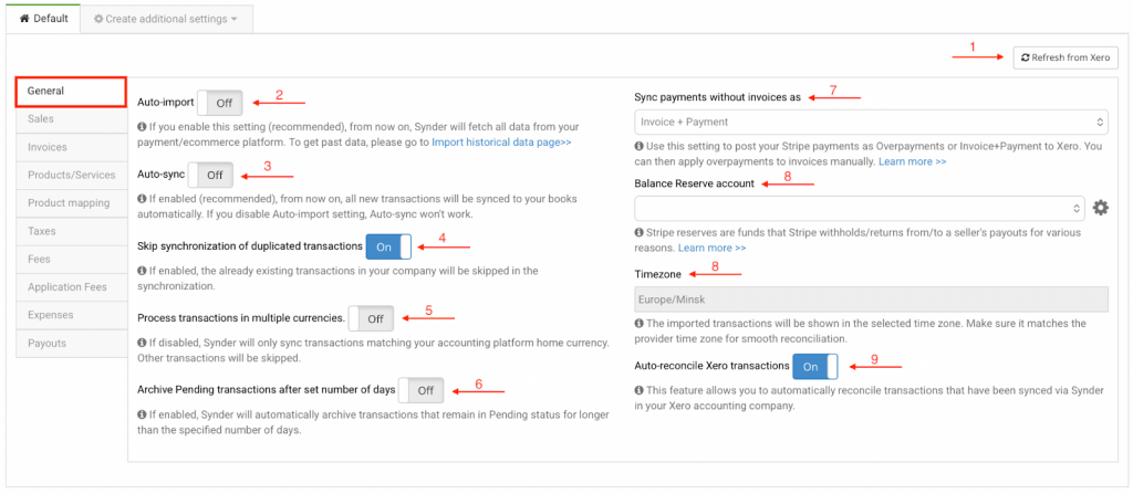 - Timezone – Shows the timezone of your Stripe account to help match dates between Stripe and Xero.