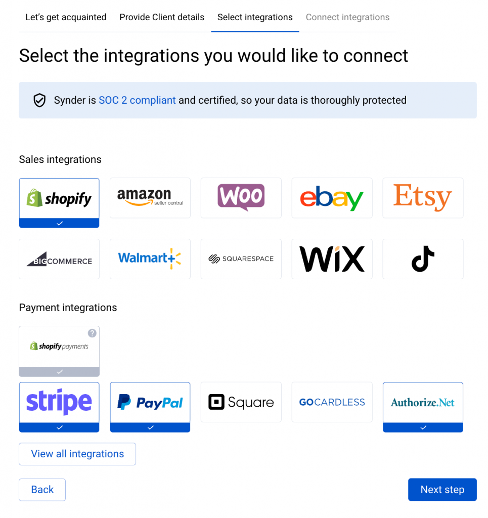 During onboarding, select every platform involved in processing your sales and payments (learn more about onboarding steps here).
