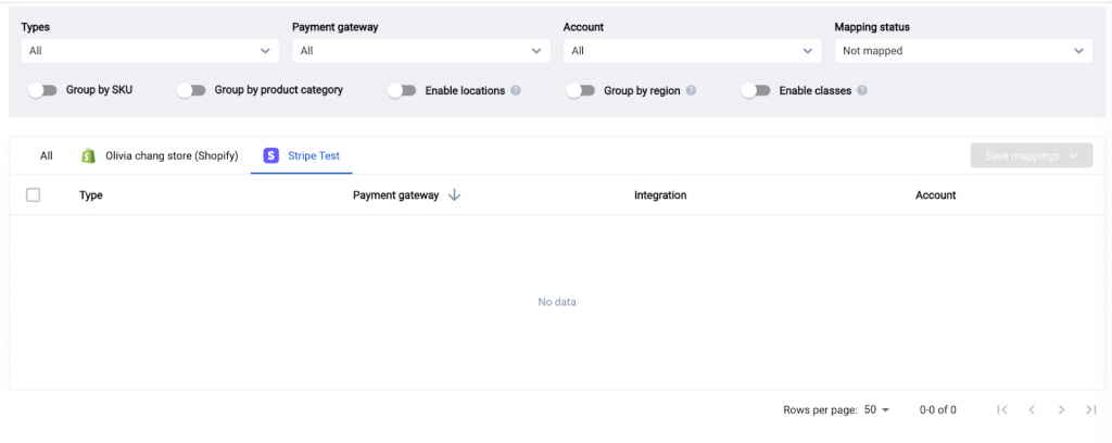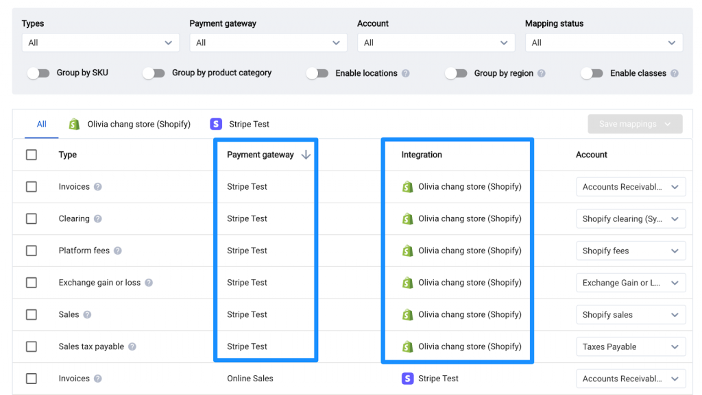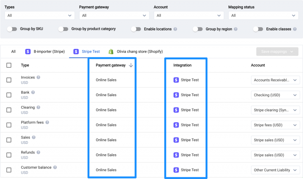 If multiple gateways are used for e-commerce sales, you will see separate mapping lines for each gateway under the e-commerce integration tab.