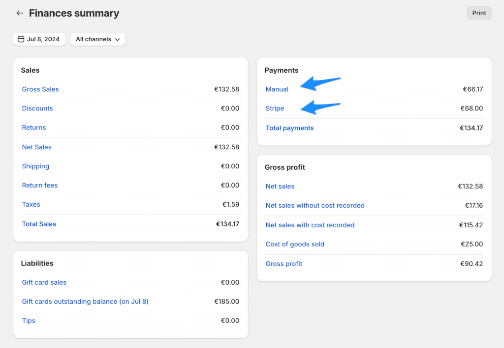 - If your Stripe integration is exclusively used for Shopify sales, there will be only one summary for the day/payout period that encapsulates payments from both platforms.