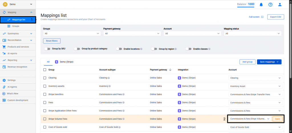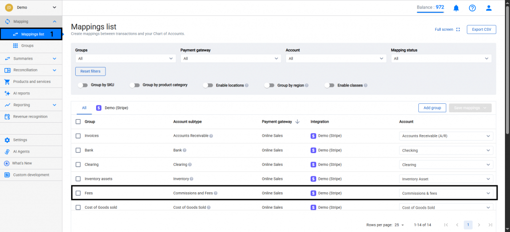 Segment individual fee categories into separate accounts – If you need a detailed breakdown by fee type, follow the steps in this guide to configure Mapping Groups and map each fee type to a dedicated account.