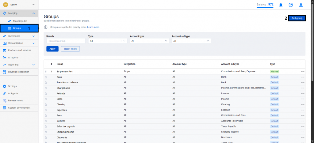 By default, all fees are recorded using the default Fee groups that Synder creates during synchronization. To create a detailed breakdown, configure Mapping Groups and use conditions in order to split the fees into multiple groups.