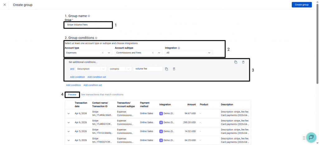 - Enter a descriptive group name (for example, “Stripe Volume Fees”).