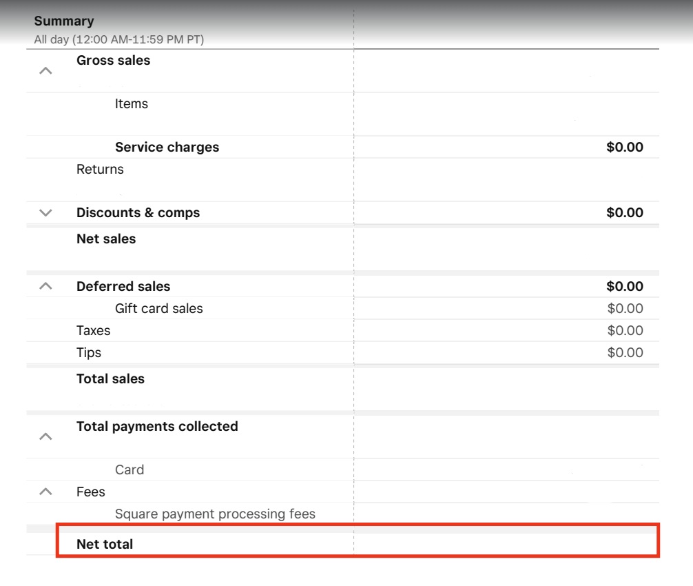 Net Total row in the Sales Summary for the period will show you the net sales total after deducting any applicable fees.