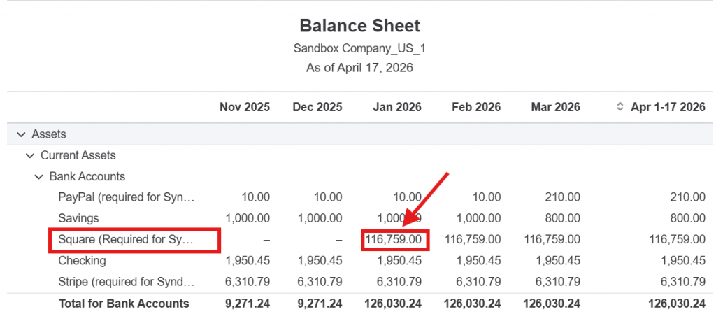 Congratulations! The amounts you will see in the QuickBooks Online Balance sheet report for the clearing account will match your Square ending balance, meaning the reconciliation was successful.