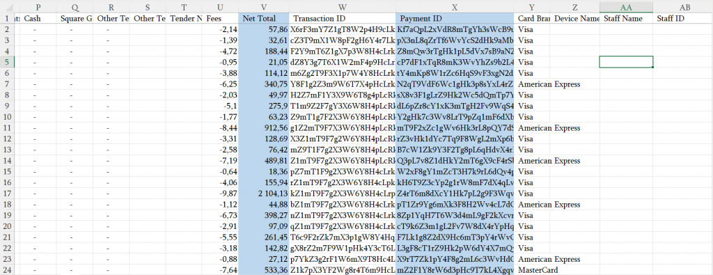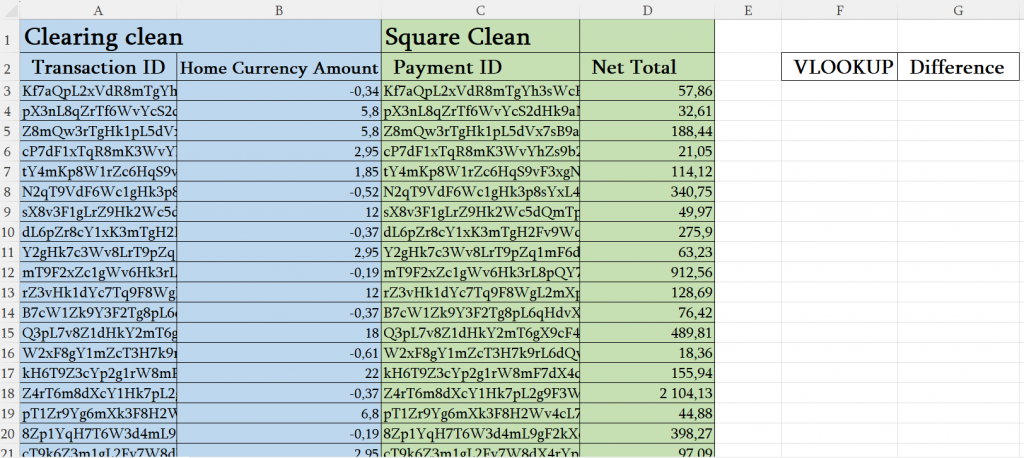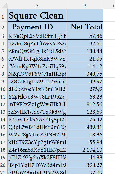 Square report includes a lot of transaction details that you don’t need for comparison. Copy values of payment ID and Net Total columns into a new sheet. This will be our Square clean report.