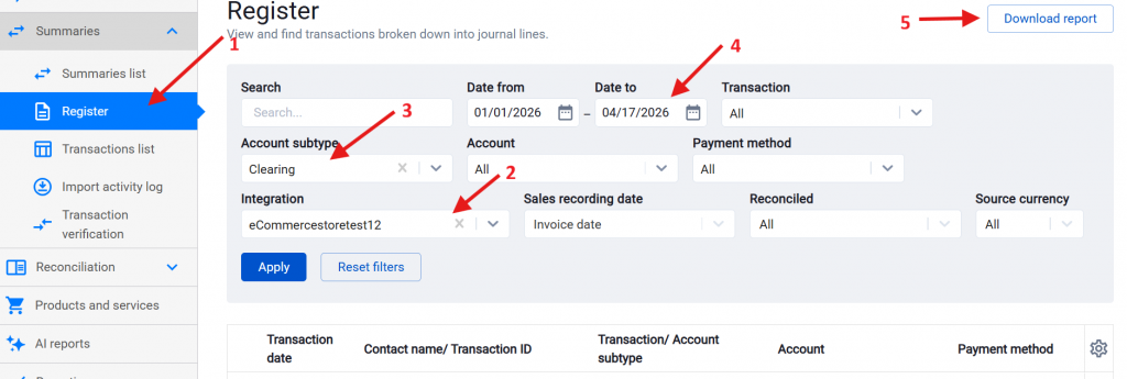 You will also need a report of the Square clearing account. In Synder summary sync mode, the transactions are recorded in your accounting platform as summarized Journal Entries. Because of this, Square clearing account report in QuickBooks Online will not include the granular data for each balance transaction. Use Synder Register tab to prepare the clearing account report instead.