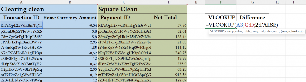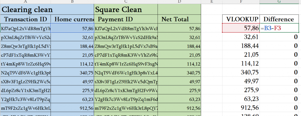 In the Difference column, calculate the difference by subtracting the looked-up amount from the Square amount.