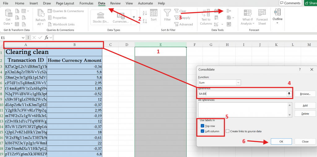 Square transactions may appear as multiple line items in the Clearing account report (e.g., one per product or fee). For accurate reconciliation, you need to consolidate these into a single row per transaction, showing the total amount. Use Excel’s Consolidate function: