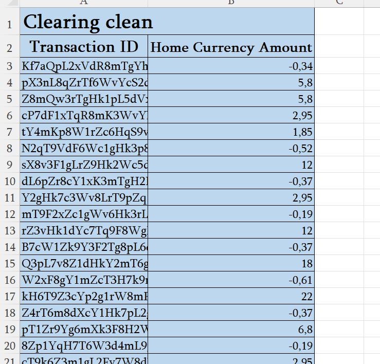 Copy values of Transaction ID and Home Currency Amount columns into a new sheet. This will be our clearing account clean report.