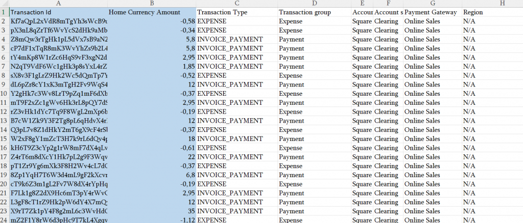 The clearing account report exported from Synder Register tab also includes details that you don’t need for comparison. You only need the Transaction ID and Home Currency Amount columns. However, first, we need to remove payout (transfer) entries and any empty cells.