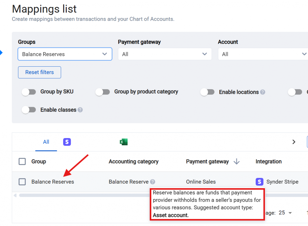 - By default, Synder creates a single Balance Reserve account and synchronizes all reserve transactions to it.