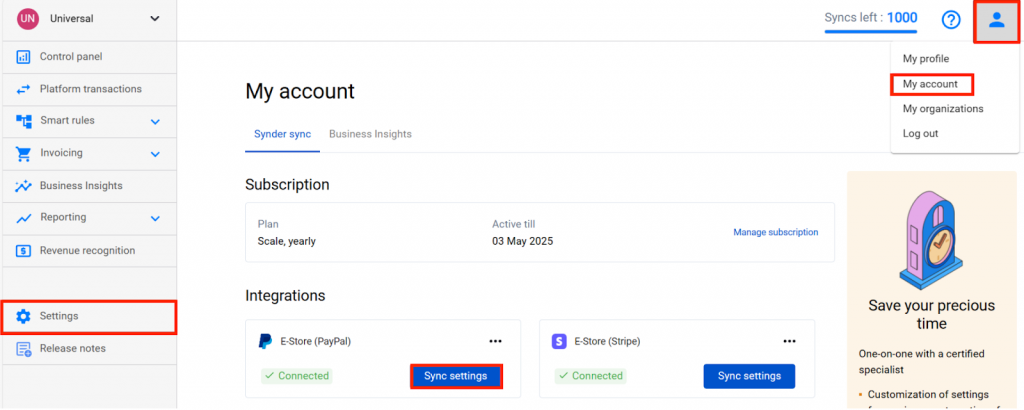 - Click Sync settings under PayPal