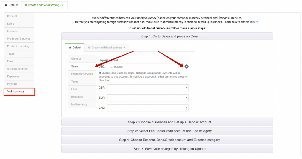 Synder automatically enables multi-currency when you enable it in QuickBooks Online. Set up your accounts to reflect real-world money flow—for example, use separate checking accounts if payouts are in different currencies. Typically, payouts are in a single currency, while sales can occur in multiple currencies.