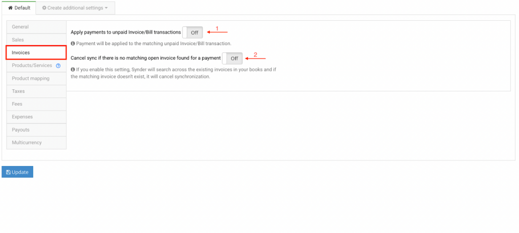 - Apply payments to unpaid Invoice/Bill transactions * – When ON, payments that match an unpaid invoice are applied automatically, ensuring invoices are closed correctly.