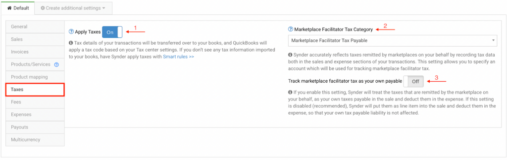- Track marketplace facilitator tax as your own payable – When ON, Synder records marketplace-remitted taxes as your tax payable in the sale and deducts them as an expense. When OFF, Synder records these taxes as a line item in the sale and deducts them as an expense without affecting your tax payable liability. See our guide for more details Marketplace Facilitator Tax.