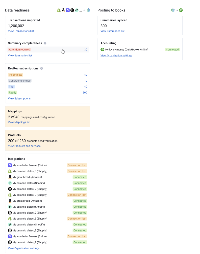 In short, use this guide to understand each Dashboard block, triage failed syncs in bulk in Per Transaction mode, or run a quick health check across companies. For single-transaction fixes, head to the Transactions list instead.