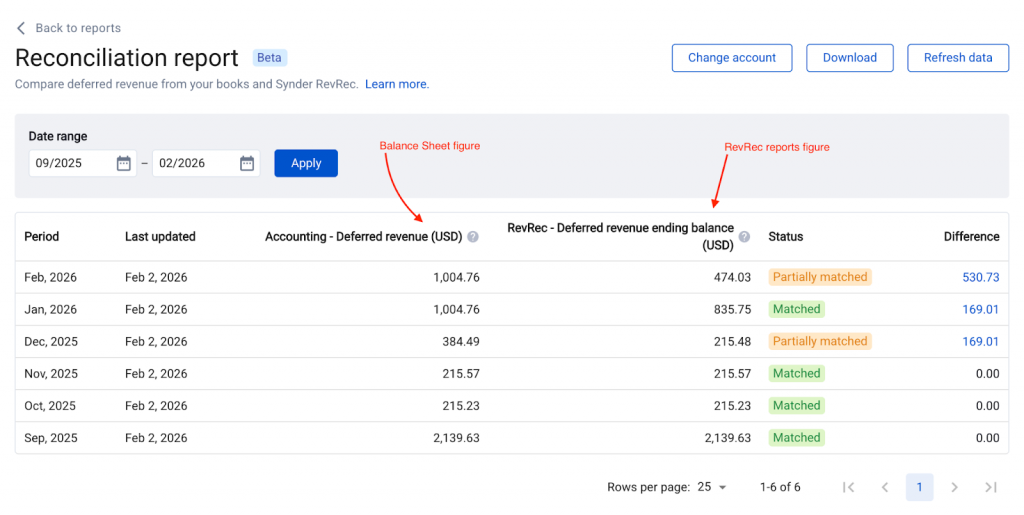 This guide explains how Synder Summary sync users can use the Deferred Revenue Reconciliation Report to compare Synder’s internal deferred revenue balance with Synder Revenue Recognition (RevRec).