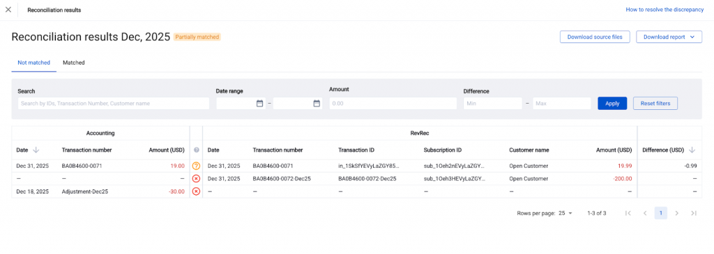 This page helps you pinpoint exactly which transactions in QuickBooks and RevRec do not align. Copy their IDs or Numbers to find the records in the systems and investigate the differences.
