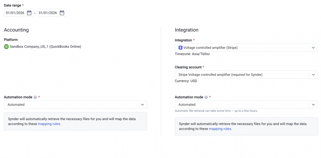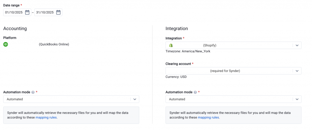 - Under Accounting, Synder pre-selects your connected accounting platform. Set the Automation mode to “Automated”.