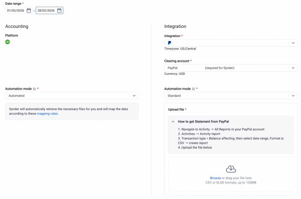 Automated — Synder downloads files from both the payment platform and your accounting software automatically. No file uploads needed.