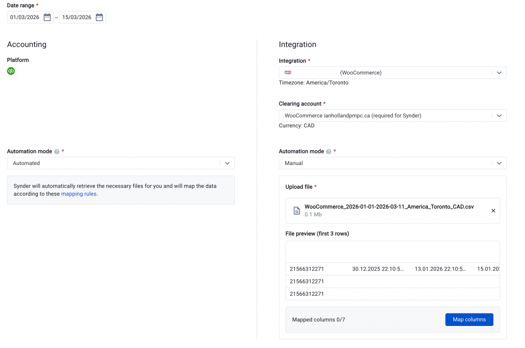 Some integrations do not offer Automated or Standard modes. Examples include Square, WooCommerce, and others. For these, use Manual mode. You upload your own CSV or XLSX file and map the columns yourself.