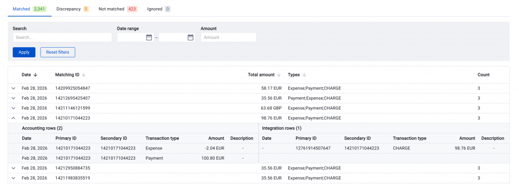 Important: Transaction dates are not used for matching. Matching is based on IDs and amounts only.