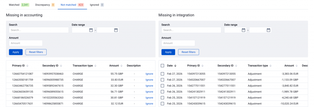 - Missing in Accounting — transactions that exist in the payment platform but not in your accounting records. They may have been skipped during sync, excluded by a filter, or fall outside your sync date range.
