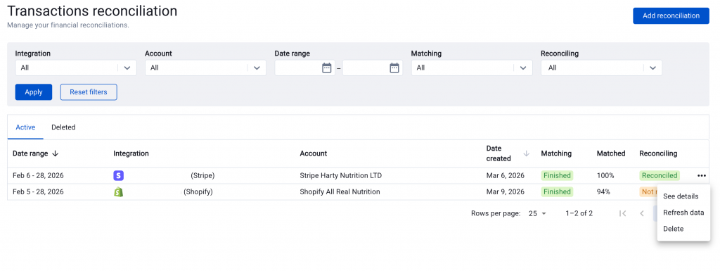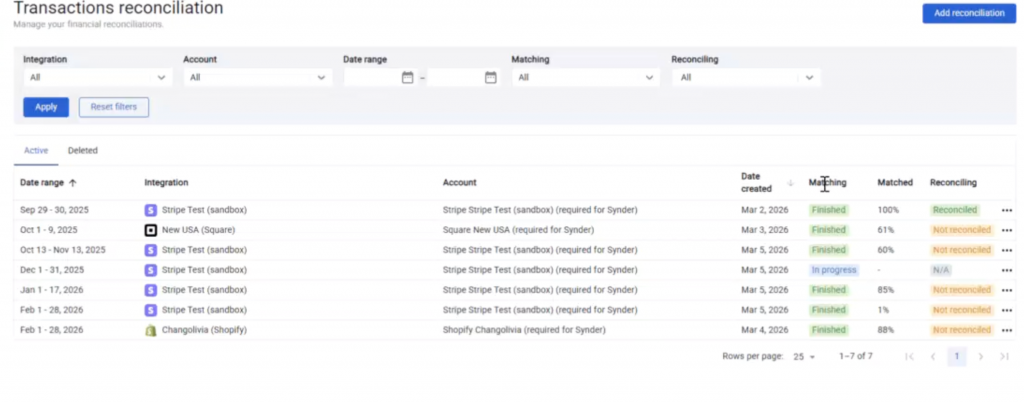 The main Transaction Reconciliation page lists all your reconciliations. You can filter them by integration, account, date range, matching status, and reconciling status.