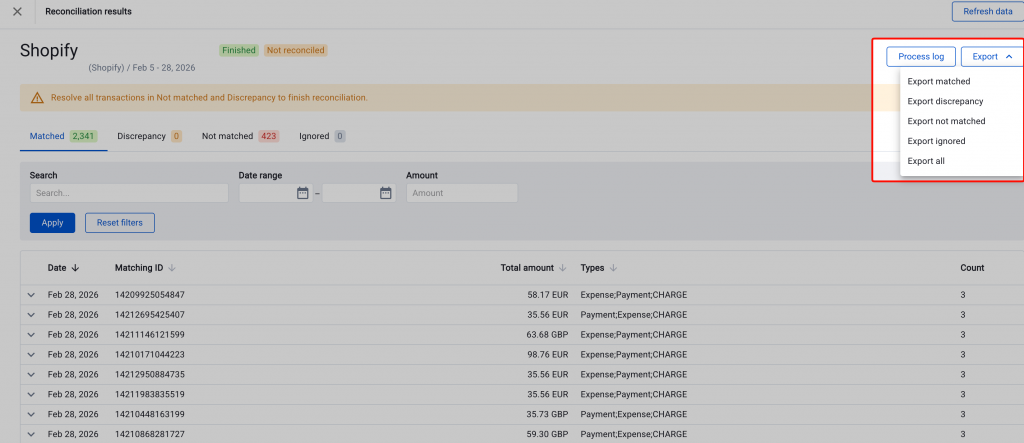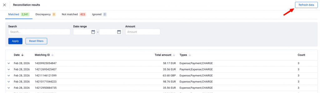 Sometimes you make changes in your accounting software after running a reconciliation. For example, you might sync missing transactions. In that case, use the “Refresh data” button. Specifically, it re-downloads only the accounting file without pulling data from the payment platform again. This saves time and replaces your previous results with updated ones.