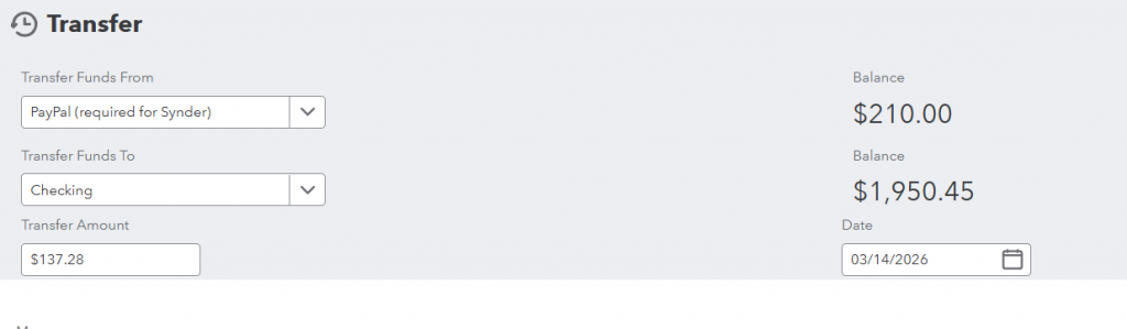 Each transfer is recorded separately so that your PayPal account in QuickBooks reflects the actual flow of funds.