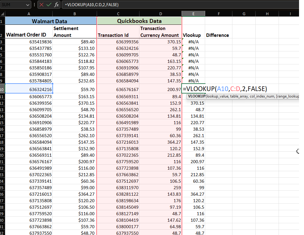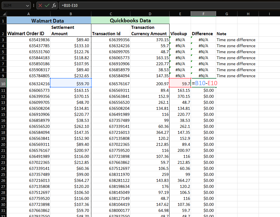 In the Difference column, subtract the looked-up QuickBooks Online amount from the Walmart amount.